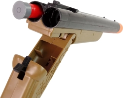 This kids' cowboy shotgun is inspired by movie westerns and will delight every little sheriff. Thanks to the break-action mechanism, it’s easy to load and features two chambers for rounds inside. Two separate triggers allow for sequential “shots,” while nothing comes out of the barrel — making play safe even for younger children.