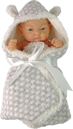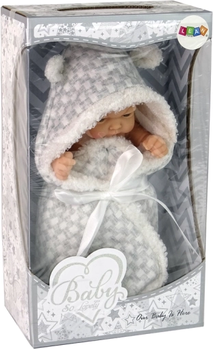 Adorable 24 cm baby doll in a gray swaddle with a bow. Safe materials, movable arms, CE/EN71 certified. Suitable from 18 months.