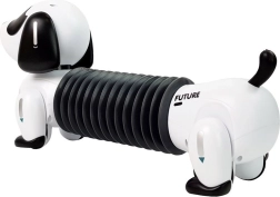 The robotic dog is a design of the future with modern technologies in mind. Its black and white look with an accordion effect enables mobility and flexibility.