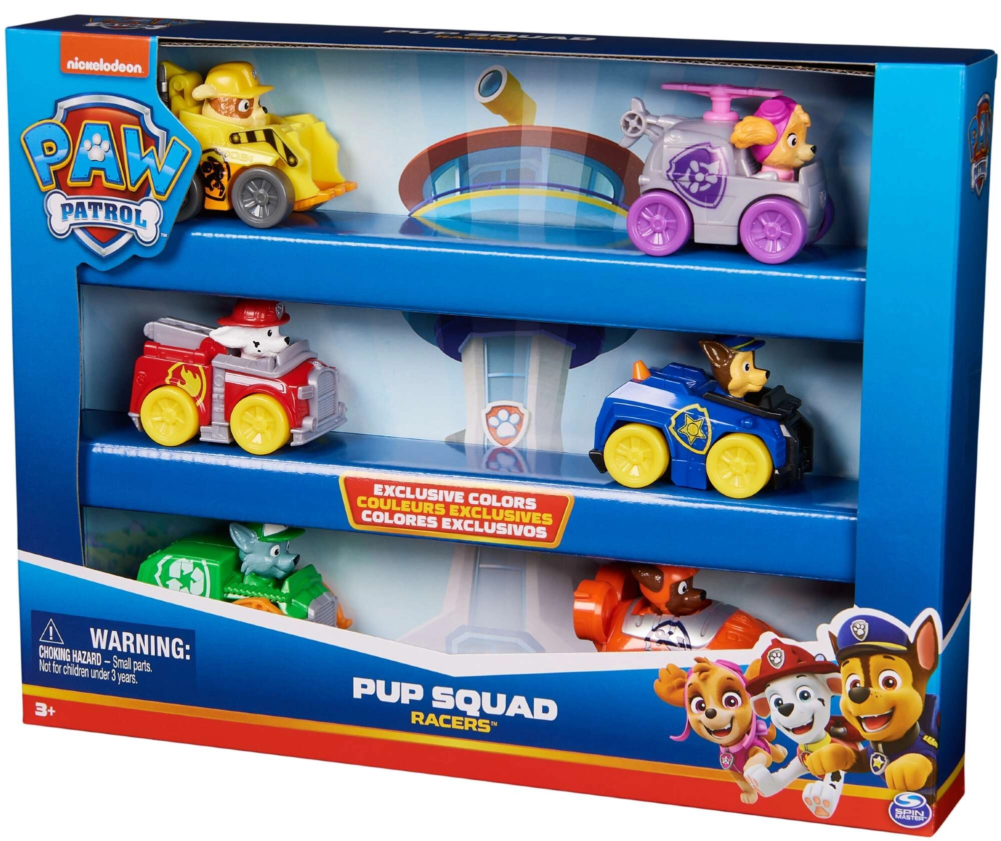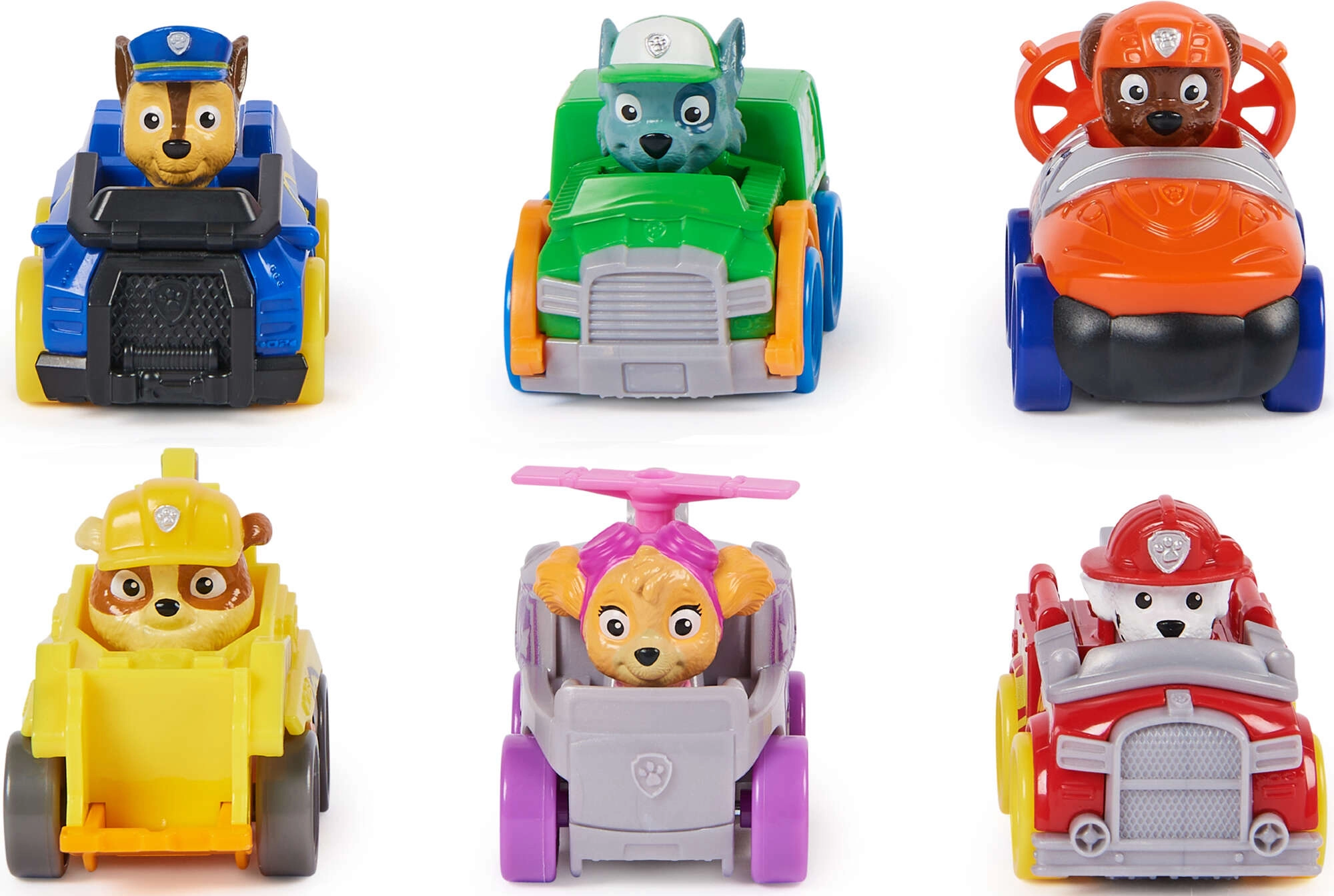 Chase, Marshall, Skye, Rocky, Rubble, and Zuma in mini vehicles ready for any mission. Ideal for collecting and playing together.