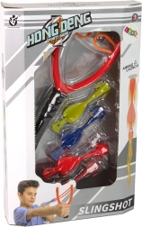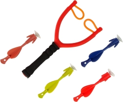 The package includes a red slingshot and four colorful suction-cup shots for safe play.