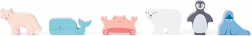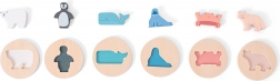 This quality wooden puzzle combines fun and learning. The animals—seal, polar bear, crab, penguin, fox, and orca—are placed into round tokens with outline cutouts and matching colors, making orientation easy and strengthening color and shape recognition.