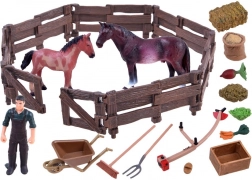 - Farmer figure (~9 cm), horse (approx. 11 × 13.5 × 3 cm), foal (approx. 9 × 10 × 2 cm), paddock with gate, wheelbarrow, feeder, pitchfork, rake, broom, sack of grain, hay bale, vegetables (cabbage, beet, carrot)