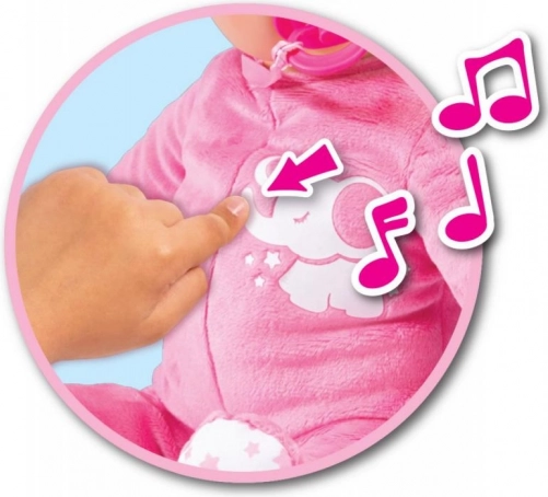 A gentle press of the tummy plays laughter, babbling, smacking sounds, and a soothing lullaby. Perfect for bedtime and daytime play.