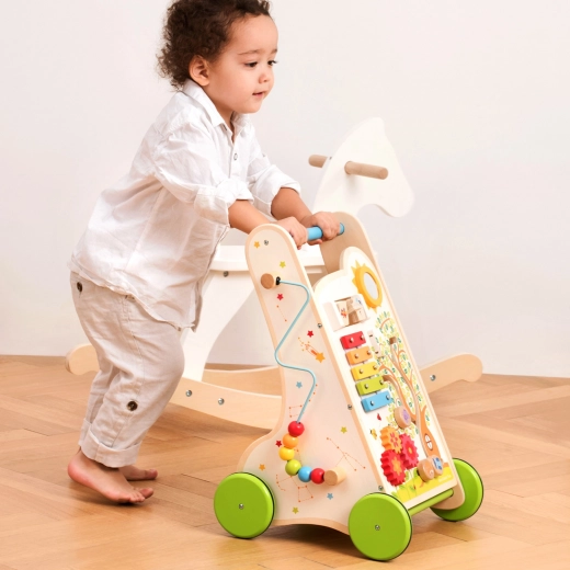 This multifunctional wooden walker is a great aid for children learning to walk and offers a wide range of interactive activities to develop motor and cognitive skills.