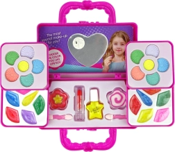 - 12 eyeshadows, 12 lip glosses, brushes, lipstick, nail polish, heart-shaped mirror
