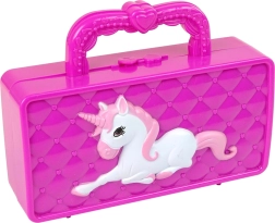 A stylish children's vanity set in the form of a fold-out handbag with a unicorn will enchant every little princess. Thanks to its compact size, it’s ideal for home and travel and keeps all treasures neatly together. The built-in heart-shaped mirror helps check the final look.