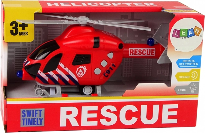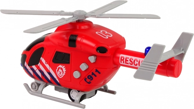 Our rescue helicopter is crafted from durable and non-toxic plastic materials, ensuring safety and health-friendliness for your child. The helicopter features widely spaced wings, three buttons producing characteristic sound and light effects, and moveable wheels with friction drive for dynamic play.