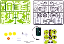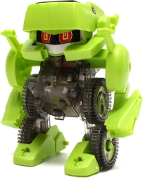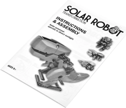 Included components: plastic parts for assembling the robot, solar panel, motor, plastic eyes, stickers, and illustrated manual.