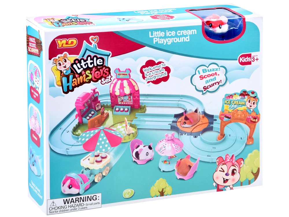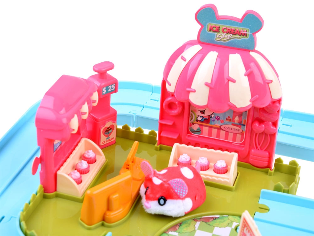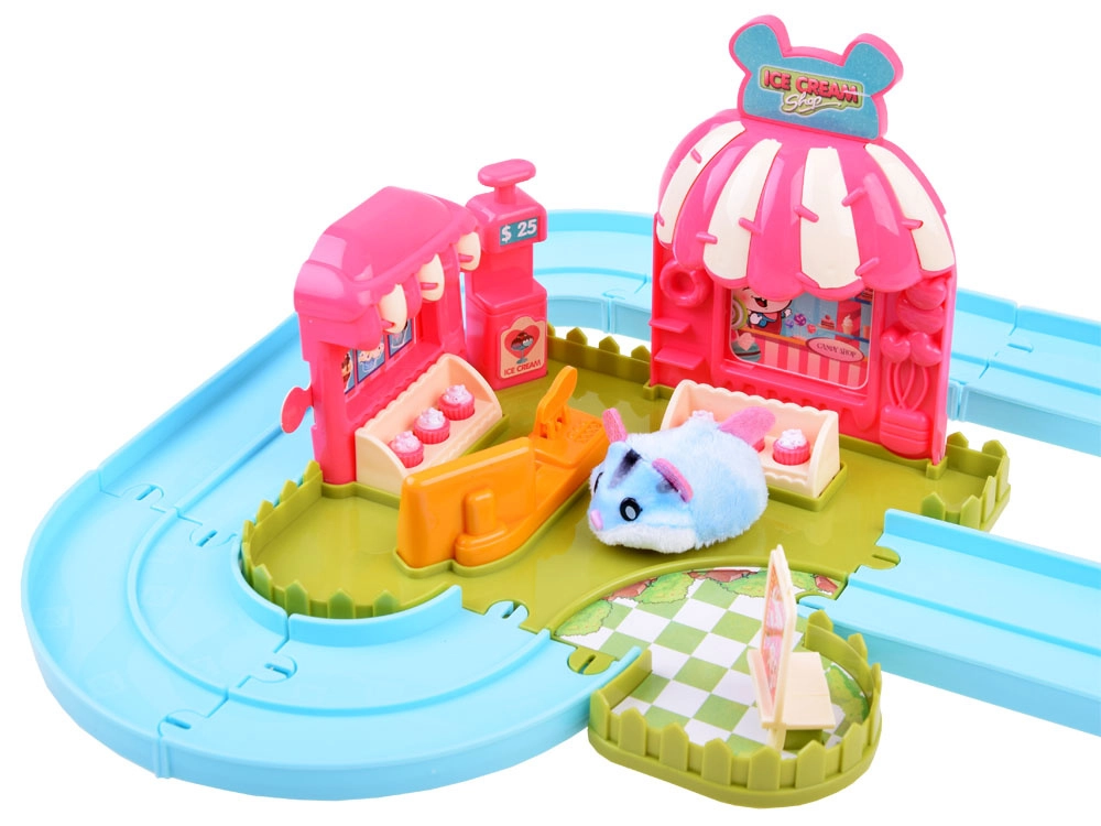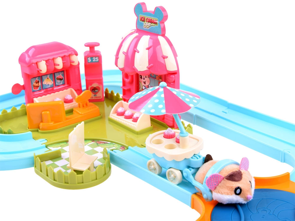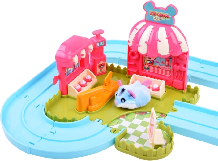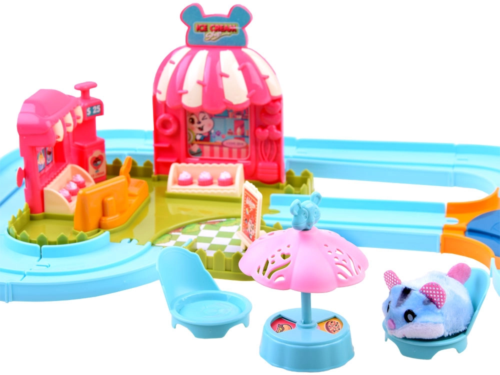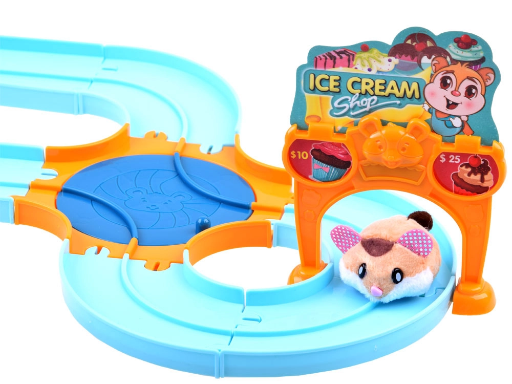 This playset brings a fun ice cream parlor world with a cute hamster featuring a super‑soft coat and ready for action straight from the box – powered by an AG13 battery (included). Once turned on, the hamster sets off and changes direction on its own and can be guided along the included easy‑to‑assemble track with a switch. With the attached cart, it delivers treats to guests.