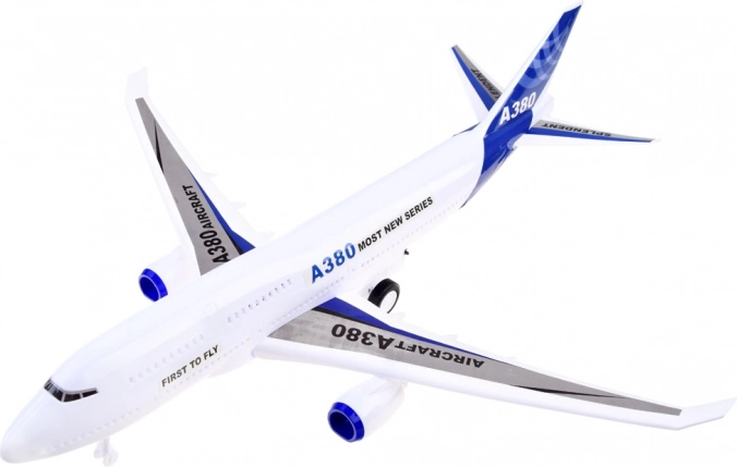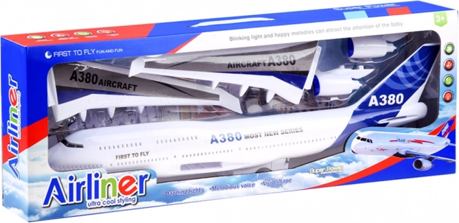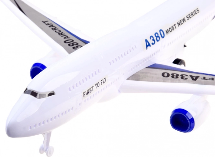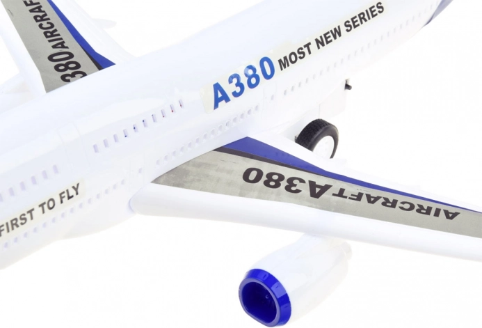 The airplane is made of high‑quality plastic with careful attention to detail. The fuselage, wings, and tail surfaces are decorated with colorful stickers. The vehicle is equipped with a drive thanks to which it can move around the airport and play along the runway. A switch is located in the landing gear that activates the sound and light functions of the toy. After starting, we will hear startup and landing sounds as well as engine operation. The sounds are accompanied by flashing lights inside the cabin.