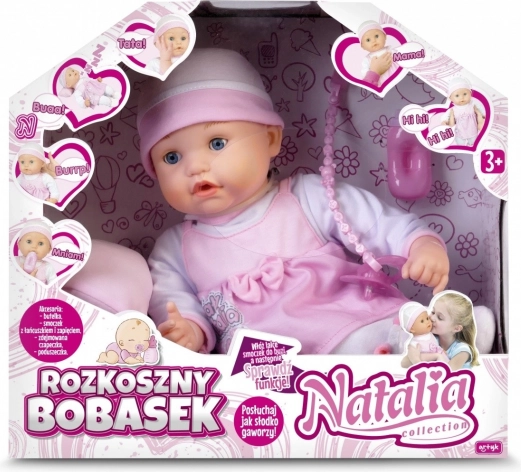 Discover an adorable interactive baby doll that sparks imagination and caregiving. The doll responds to the bottle or pacifier, to touch on the chin, cheeks, and tummy, and to rocking. It can say “mama” and “dada”, laughs, cries, softly snores, and burps after meals. Thanks to its soft body, it’s lovely to cuddle and perfect as a first doll.