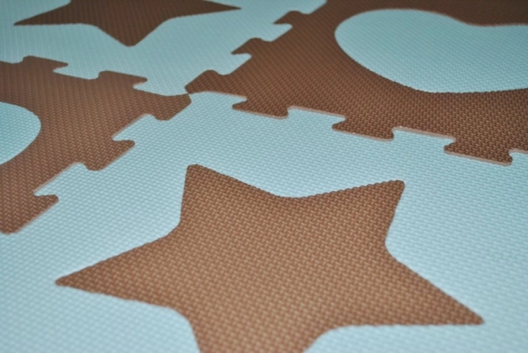 Soft foam puzzle with stars and hearts for children from 10 months. Non-slip, washable, 1 cm thick, reduces noise and insulates from cold. Meets EN71 standards.