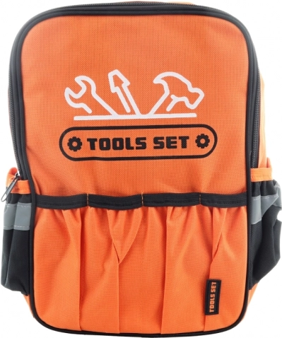 The perfect tool set for kids, provided in a practical fabric backpack. This set includes a wide range of tools, including: