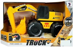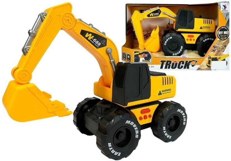 Realistic yellow-black excavator for children aged 3+ featuring a friction drive, light effects, and horn and reverse sounds. The movable arm and bucket encourage creative construction play. Made of high-quality plastic, safe and durable, with CE certification and EN 71 standard.