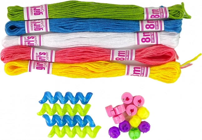 Beads in vibrant colors and five eight‑meter threads (green, blue, white, pink, yellow) for endless combinations and a personal style.