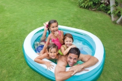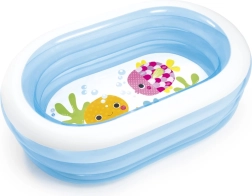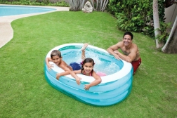 This transparent inflatable pool for kids features a delightful 'Underwater World' motif at the bottom. Made from durable, tested vinyl, the pool boasts clear sidewalls and three independently inflatable rings to prevent accidental air leaks. Additionally, it includes a handy drain valve and a repair kit for minor damages.