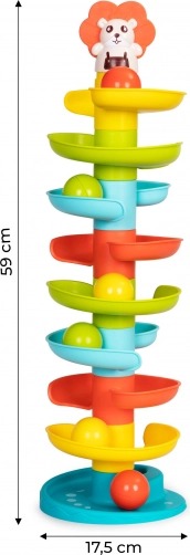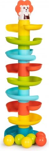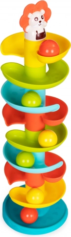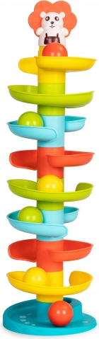 A tower with a twisted slide for balls is a great toy for the youngest children who will watch and chase the balls with joy. Using it will develop motor and manual skills, letting you combine engaging play with the child's sustainable development.