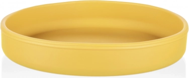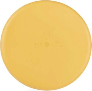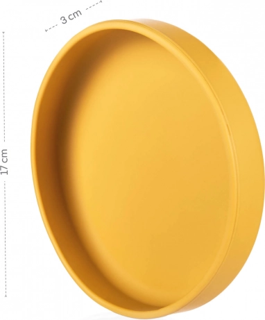 Silicone plate with suction cup in mustard yellow color for easy child feeding. Safe, durable, and easy to clean.