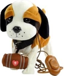 The interactive brown and white St. Bernard on a leash is made of soft and eco-friendly material that is pleasant to the touch. It features large dark eyes, a prominent tail, and a distinctive nose. The toy includes a long leash with a switch, allowing the child to easily control their pet. The dog dances and sings, adding fun and realism to the play.