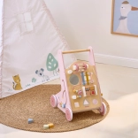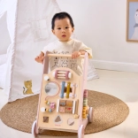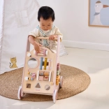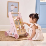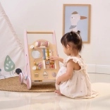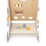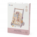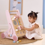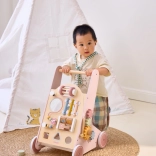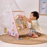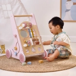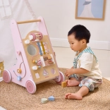 Introducing the Wooden Toddler Walker PolarB in pink, designed for children from 18 months. It combines fun activities like mirror play, rotating blocks, glittering beads, shape sorting, and playing the xylophone. With this walker, your children will safely discover the world around them.