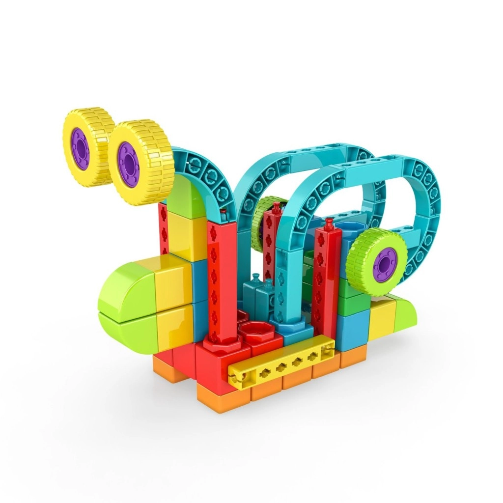 Sturdy, colorful pieces connect with a snap-click system. Children can safely and independently practice fine motor skills and coordination.