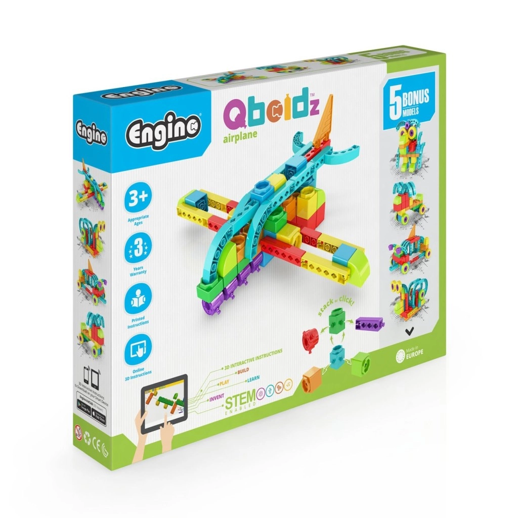 Discover the creative construction set ENGINO Qboidz Airplane for children aged 3+, with which you can build up to 5 different models — from animals to an airplane. Thanks to easy snap-click pieces, vibrant colors, and the interactive kidCAD app, kids practice fine motor skills, creativity, and logical thinking. The set is compatible with other ENGINO kits and made in the EU.