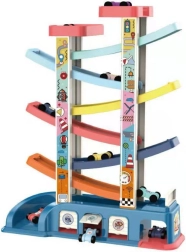 This slide racing track turns every car into a little speedster. Children place the cars on the top ramp and watch them zip down through the levels. The pastel, visually pleasant color palette keeps attention, while the compact size fits a child’s room or play corner.