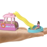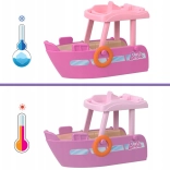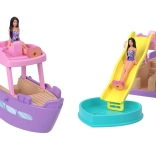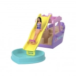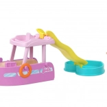 This colorful playset puts mini water adventures in the hands of kids ages 4 and up. The boat in pink and purple tones features a top deck with seating, a cabin, and unfolds into play mode with a bright yellow slide and a turquoise heart-shaped pool. A mini doll in a swimsuit is included, ready to set off on a holiday cruise.