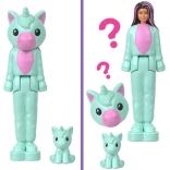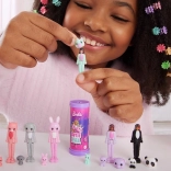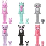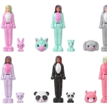 Mini BARBIE Cutie Reveal dolls bring the joy of unboxing – remove the animal costume hood to reveal a unique face, hair, and style. Each figure has a poseable waist and can be displayed on a heart-shaped stand. A mini pet is included to inspire imaginative stories.