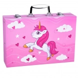 Case with a playful unicorn design, easily portable thanks to the metal handle.