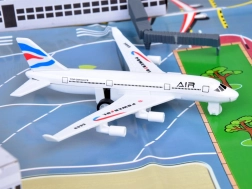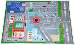 The colorful play mat with airport structures provides an authentic atmosphere for young pilots and air traffic controllers.