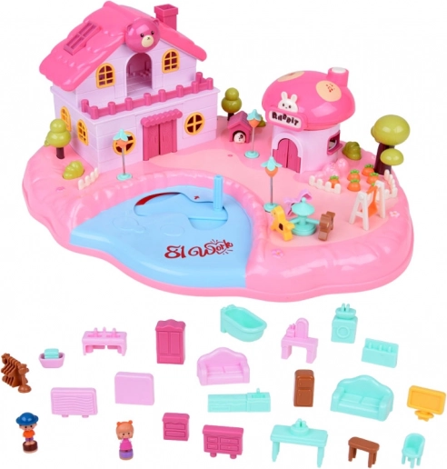The house offers a multi-level interior with scenes for everyday play: a cozy bedroom with a bed, an opening wardrobe, a bathroom with a bathtub and sink, a kitchenette with a fridge, and a vanity table. Light and sound effects triggered by buttons enhance the play atmosphere, and the backlit RABBIT sign reacts to the melody’s rhythm.
