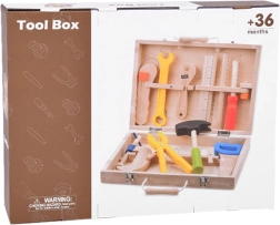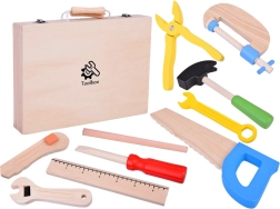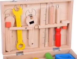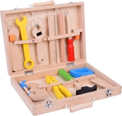 Discover a quality wooden case filled with colorful tools for little builders. The set supports fine motor skills, creativity, and learning how tools work. All parts are made of safe, non-toxic lacquered wood and stored in a practical lockable case with compartments.