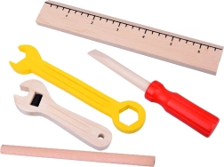 The set includes a ruler with a scale that encourages learning numbers and estimating distances during making and fixing.