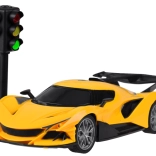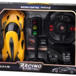 Experience realistic racing with this RC sports car set featuring a steering wheel + pedals and a working traffic light. The futuristic car with a low chassis, rear spoiler, and front headlights offers excellent grip thanks to its rubber tires. Control is intuitive – steer direction with the wheel, use the pedals to accelerate forward or reverse. The rechargeable battery keeps running costs low.