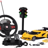 - Complete set: car, steering wheel, pedals, traffic light, battery, and USB cable.