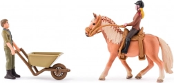 The set includes everything for horse care: a paddock/shelter, a horse with rider, a farmer with a wheelbarrow, and small accessories. The 12 × 10 cm horse is sized just right for children’s hands.