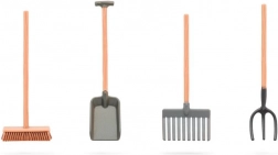 Stable/paddock and shelter, horse, rider figure, farmer figure, wheelbarrow, bucket, broom, shovel, rake, pitchfork