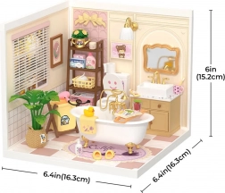 Create your own bathroom diorama in soft pastel tones with a clawfoot tub, mirror, shelves, and plenty of miniature accessories. Thanks to precisely cut parts made from sturdy materials, you’ll assemble the model easily and without glue — resulting in a solid, beautifully detailed mini scene, perfect for a shelf or as a gift.