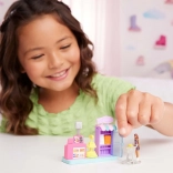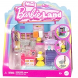 The BARBIE mini doll (approx. 3.5 cm) bends at the waist, can sit or lean on the counter, and stands on a heart-shaped base that fits other houses, vehicles, and sets in the MINI BARBIE LAND series. Play naturally develops imagination, fine motor skills, and social skills.