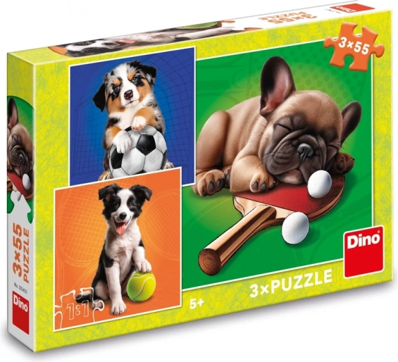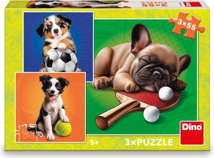 Dog Athletes puzzle set: 3×55 pieces made from high-quality, non-toxic cardboard. Size 18×18 cm, age 5+. Made in the Czech Republic.