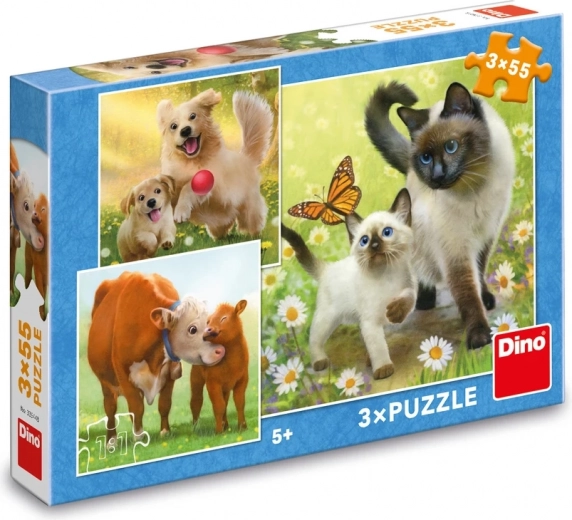 This set includes three separate jigsaws with 55 pieces each, featuring cheerful illustrations of dogs, cats, and other animals. Thanks to sturdy cardboard, the puzzles are sufficiently durable for frequent use and easy to handle.
