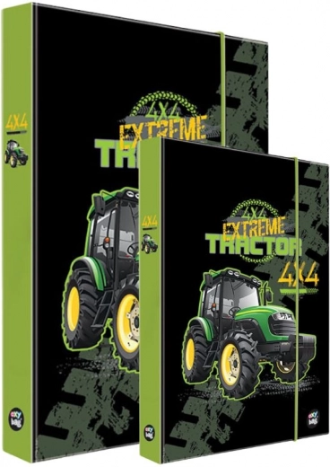 This set of notebook boxes in the popular A4 and A5 formats is an essential part of school gear. The high-quality laminated surface effectively protects against scuffs and moisture, while the flexible elastic band reliably keeps the contents together. The stylish tractor motif will delight little machine lovers and make organizing school materials easier.