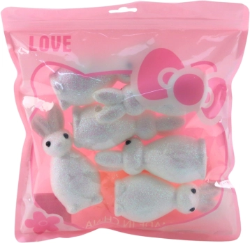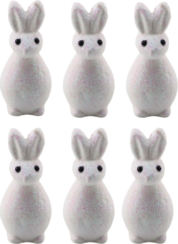 An elegant set of 6 white polystyrene bunnies with a sparkling effect for charming Easter decorations. A lightweight and safe ornament for the table, basket, or kids’ room that instantly creates a festive atmosphere.