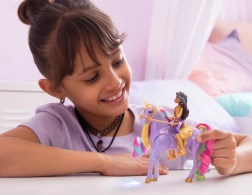 Wildstar is equipped with light effects that activate by pressing the star on the unicorn's side, allowing children to reenact favorite scenes from the stories. Sophia is flexible with 7 points of articulation to ride on Wildstar, who stomps its hoof and projects a rainbow pattern.