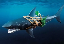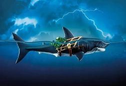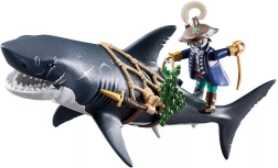 The giant shark with pirate from PLAYMOBIL brings children thrilling tales from the ocean depths. Just pull the lever and the gigantic maw opens, ready to “snap up” prey; release it and it automatically closes. The pirate figure holds onto the net, is armed with a saber and daggers, and is ready for any naval skirmish.