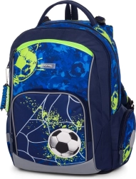 Stylish 3-piece school set for young footballers: OXY GO backpack, drawstring bag and pencil case. The backpack features an anatomically shaped, breathable back panel, adjustable straps with hooks, a sturdy waterproof base and reflective elements. Ideal for grades 1–3, capacity 22 l, weight 930 g.
