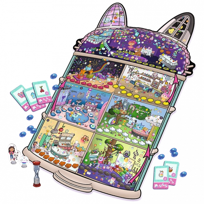 - Large illustrated game board in the shape of Gabby’s Dollhouse.