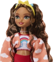 Long wavy brown hair with a headband and bow, a rainbow crop top, a cloud-print cardigan, and a red skirt—all easy to mix, match, and remove.